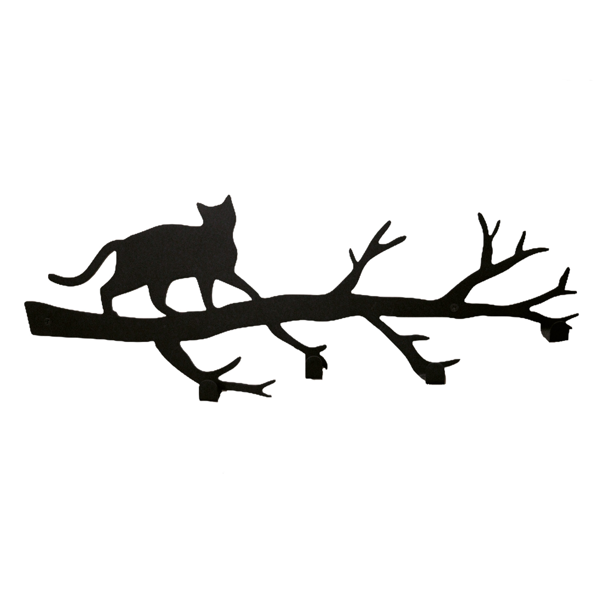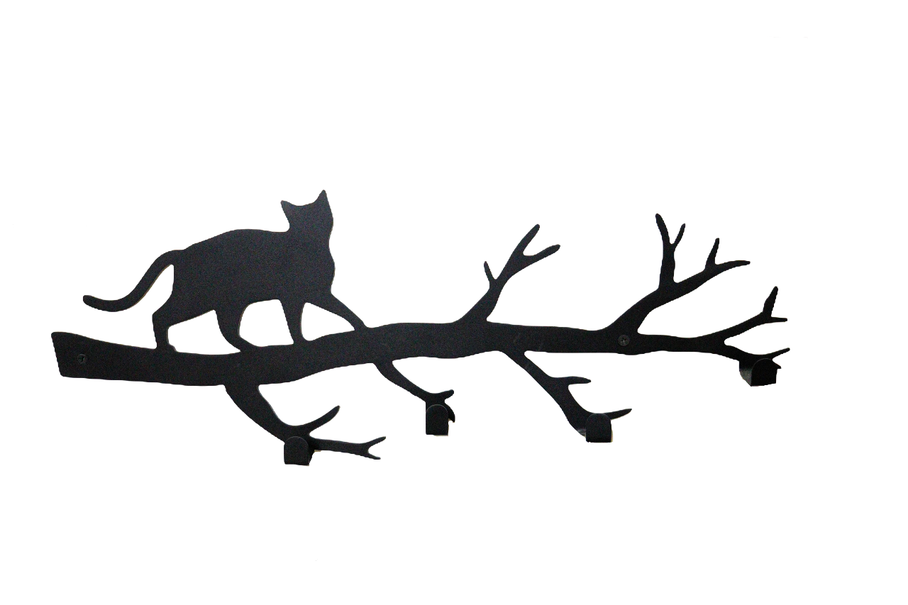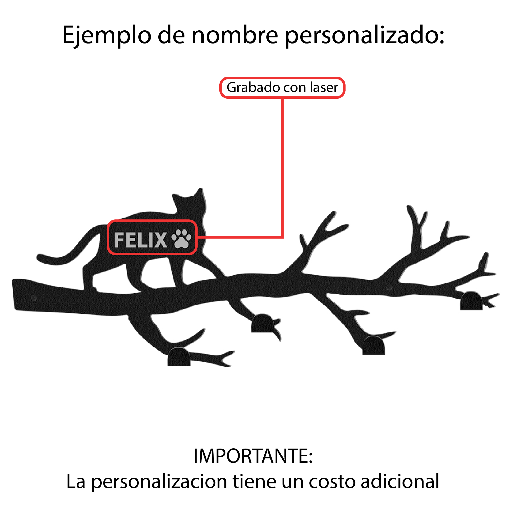 Perchero de pared con diseño de gato sobre una rama, fabricado en acero cold roll con pintura electrostática negra. Personalizable con el nombre de tu mascota, incluye tornillos y cinta doble faz para fácil instalación. Ideal para organizar tu hogar con estilo y funcionalidad.