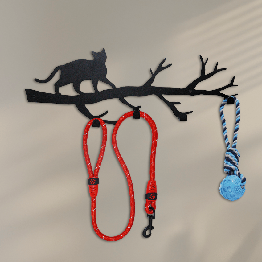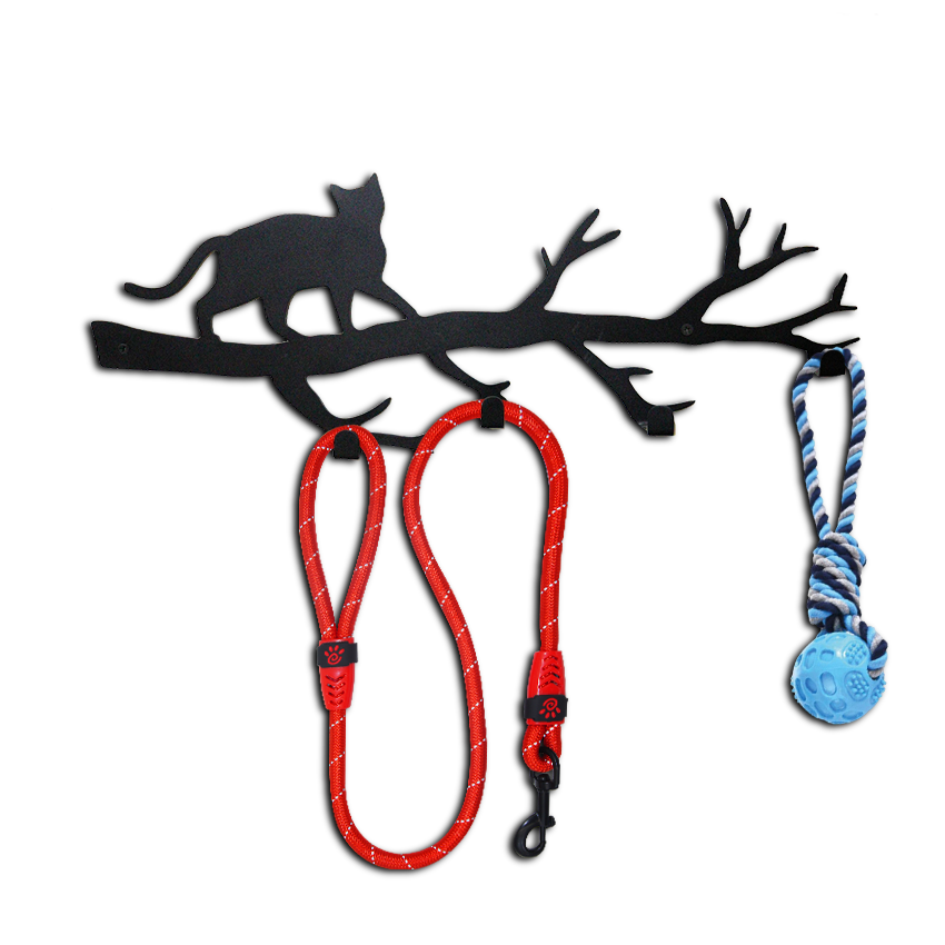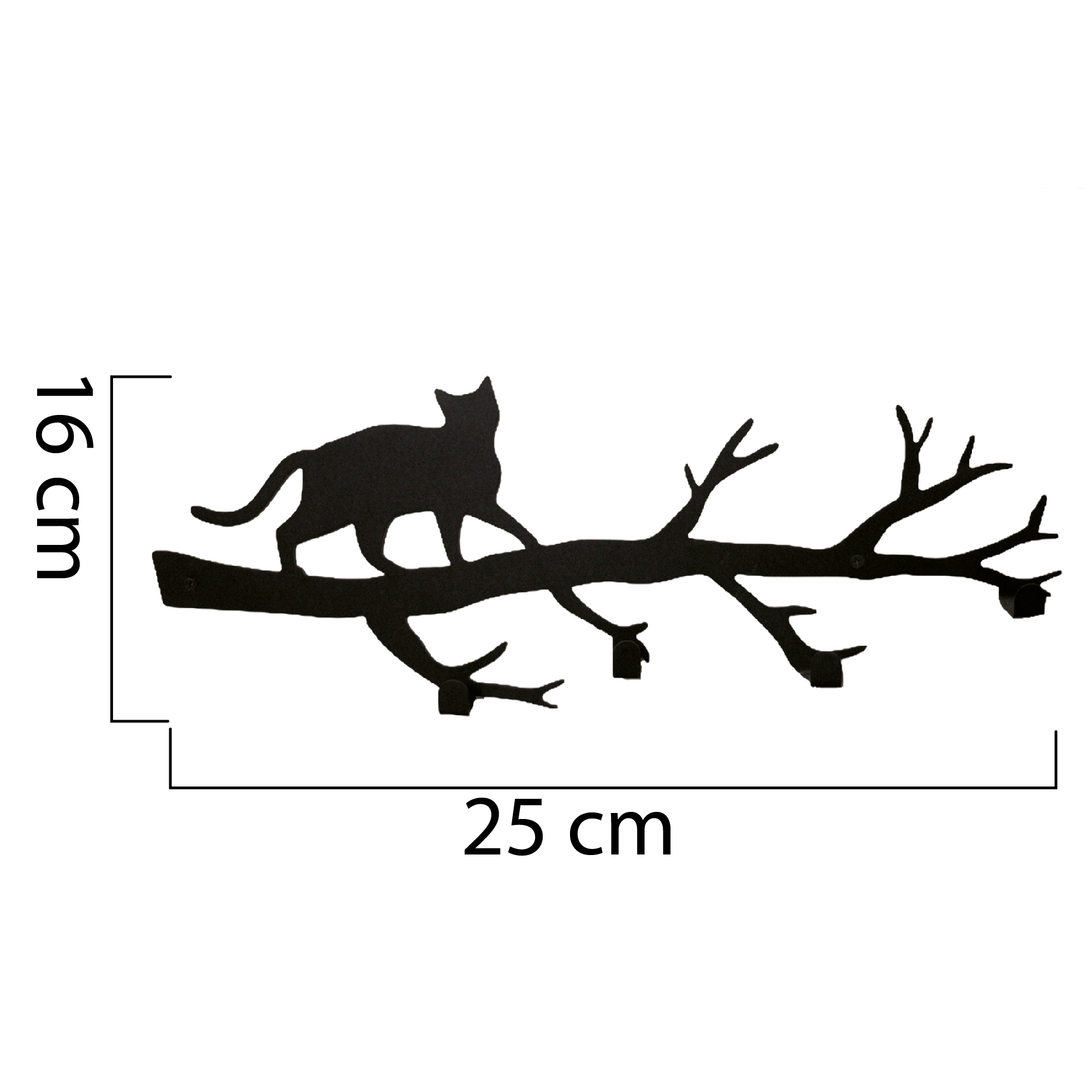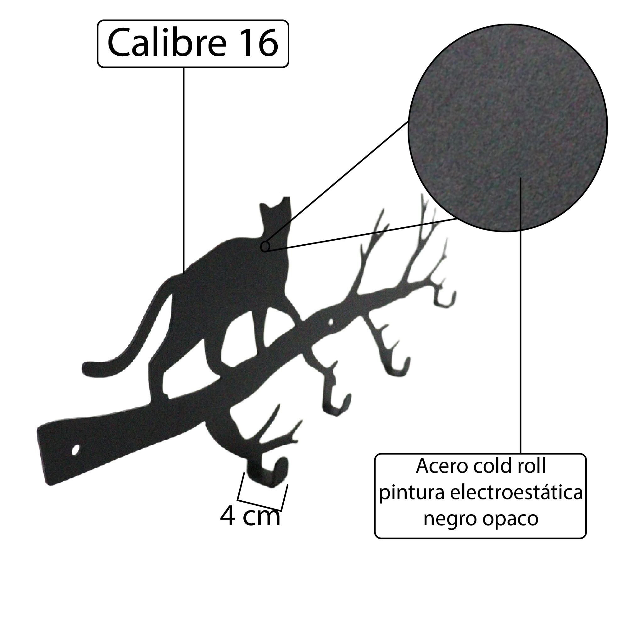 Perchero de pared con diseño de gato sobre una rama, fabricado en acero cold roll con pintura electrostática negra. Personalizable con el nombre de tu mascota, incluye tornillos y cinta doble faz para fácil instalación. Ideal para organizar tu hogar con estilo y funcionalidad.