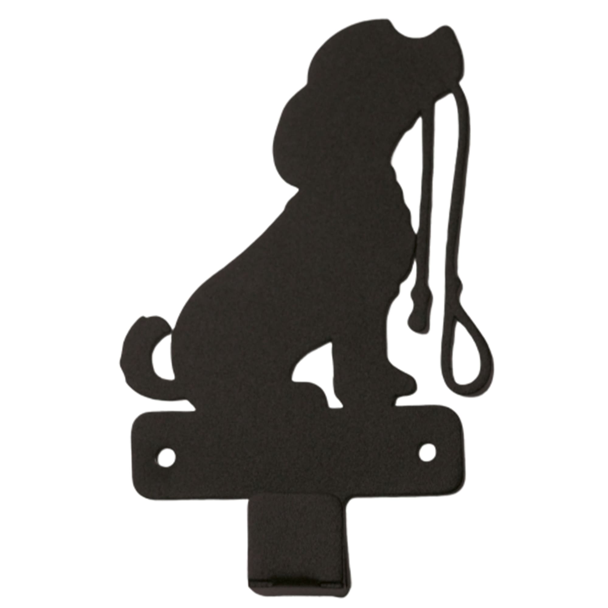 Perchero funcional fabricado en acero cold roll con un diseño único de un perro llevando una correa en la boca, pintado con pintura electrostática negra mate de alta calidad. Ideal para instalar en la pared, proporcionando orden y practicidad en cada salida con tu mascota.