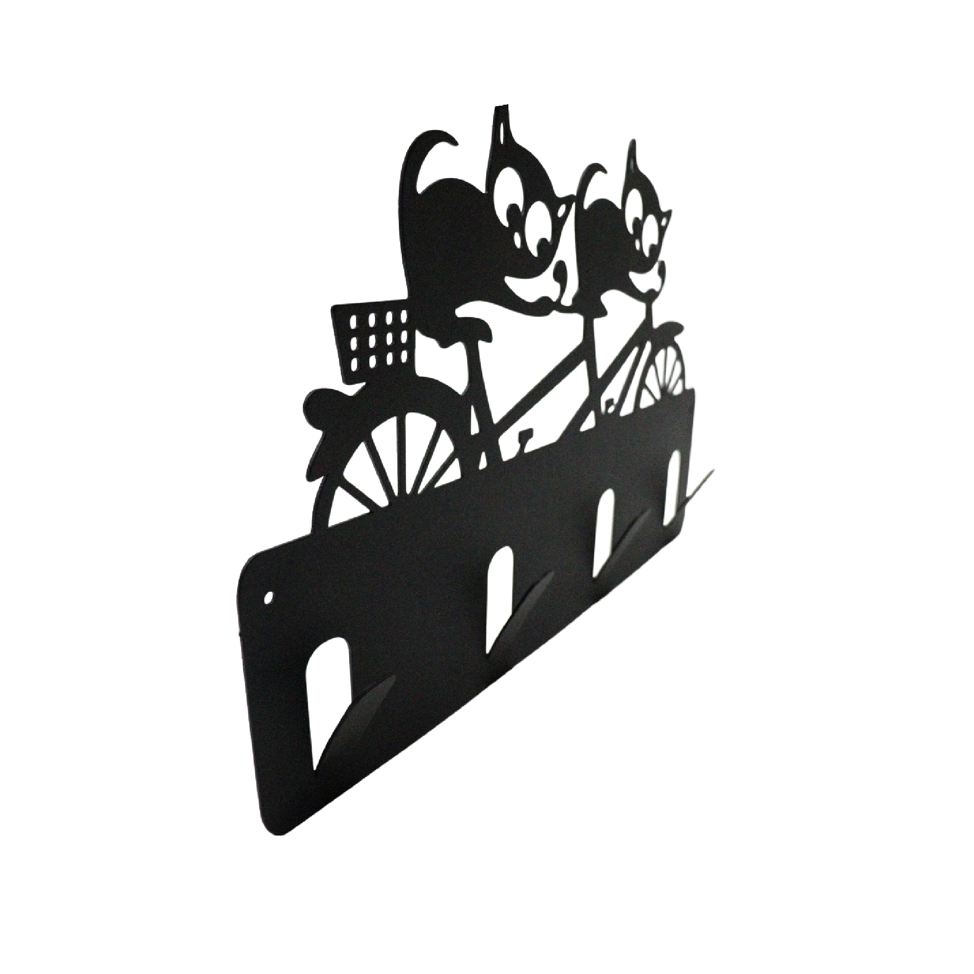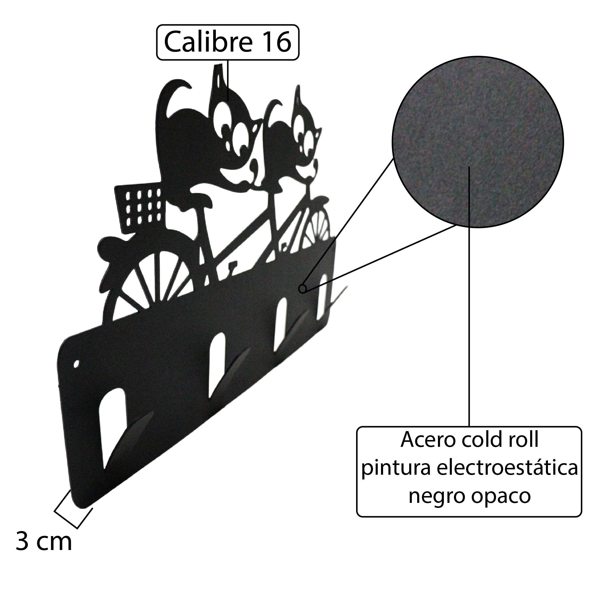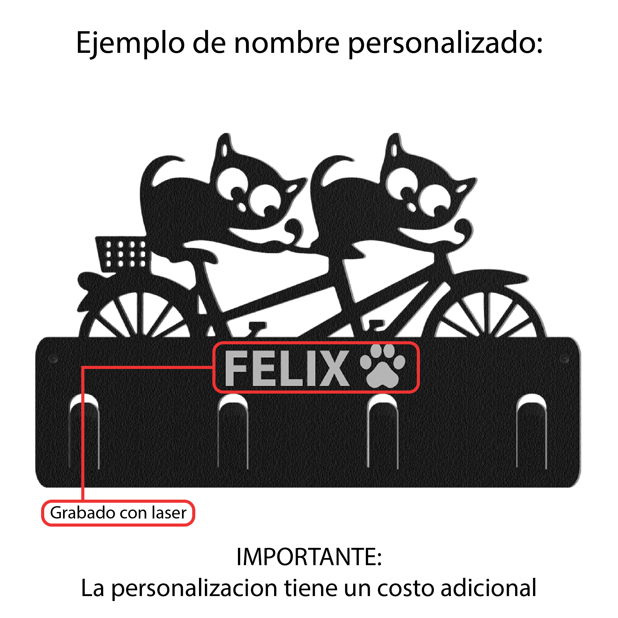 Estilo funcional para tu rutina diaria: Perchero de acero cold roll con diseño de dos gatos en bicicleta, pintura electroestática negro opaco de alta calidad, instalable en la pared para una máxima eficiencia y orden en cada salida. Este accesorio combina la robustez del acero con la belleza del diseño inspirado en nuestros pequeños amigos felinos. Además, puedes personalizarlo con el nombre de tu mascota por un adicional de 8.000 pesos colombianos.