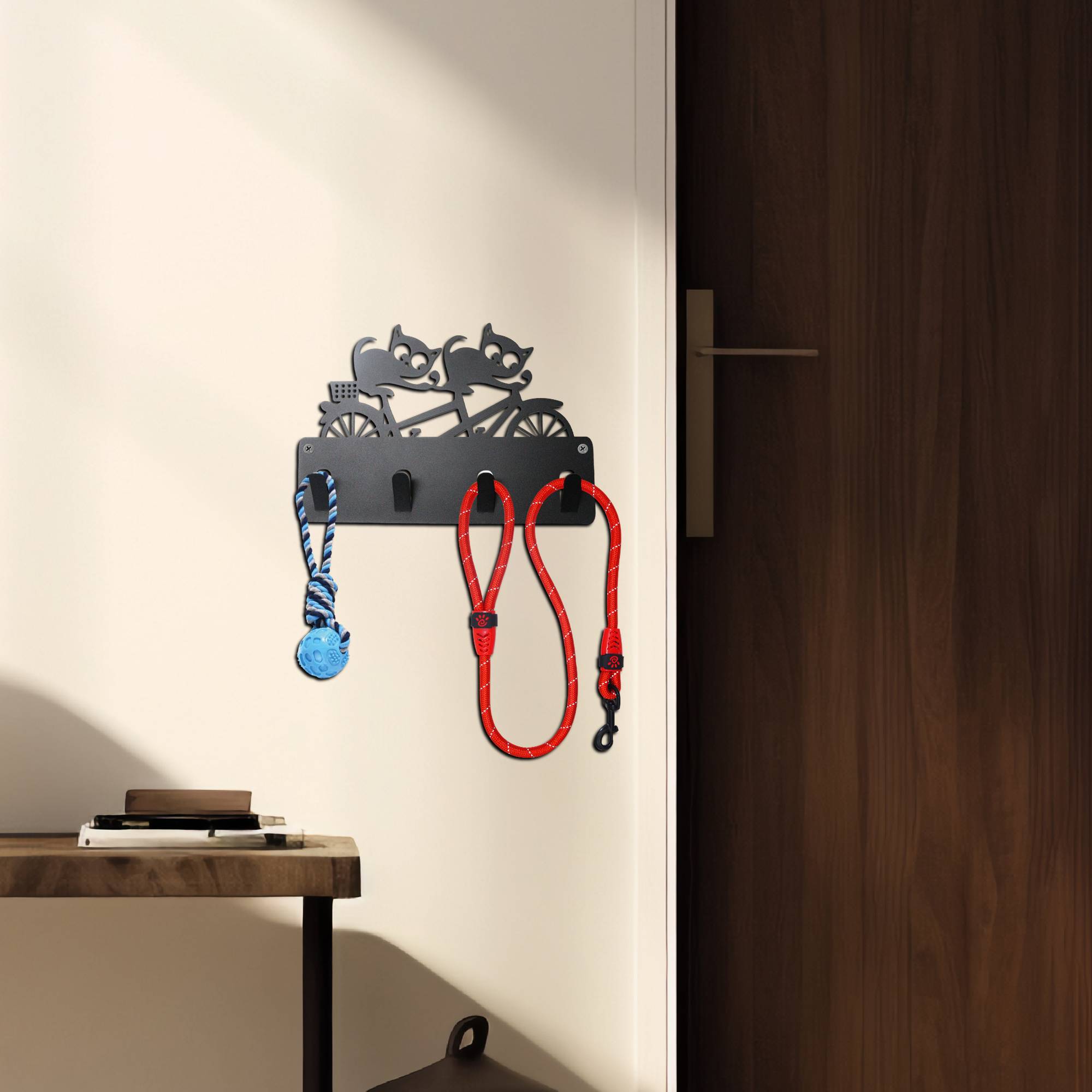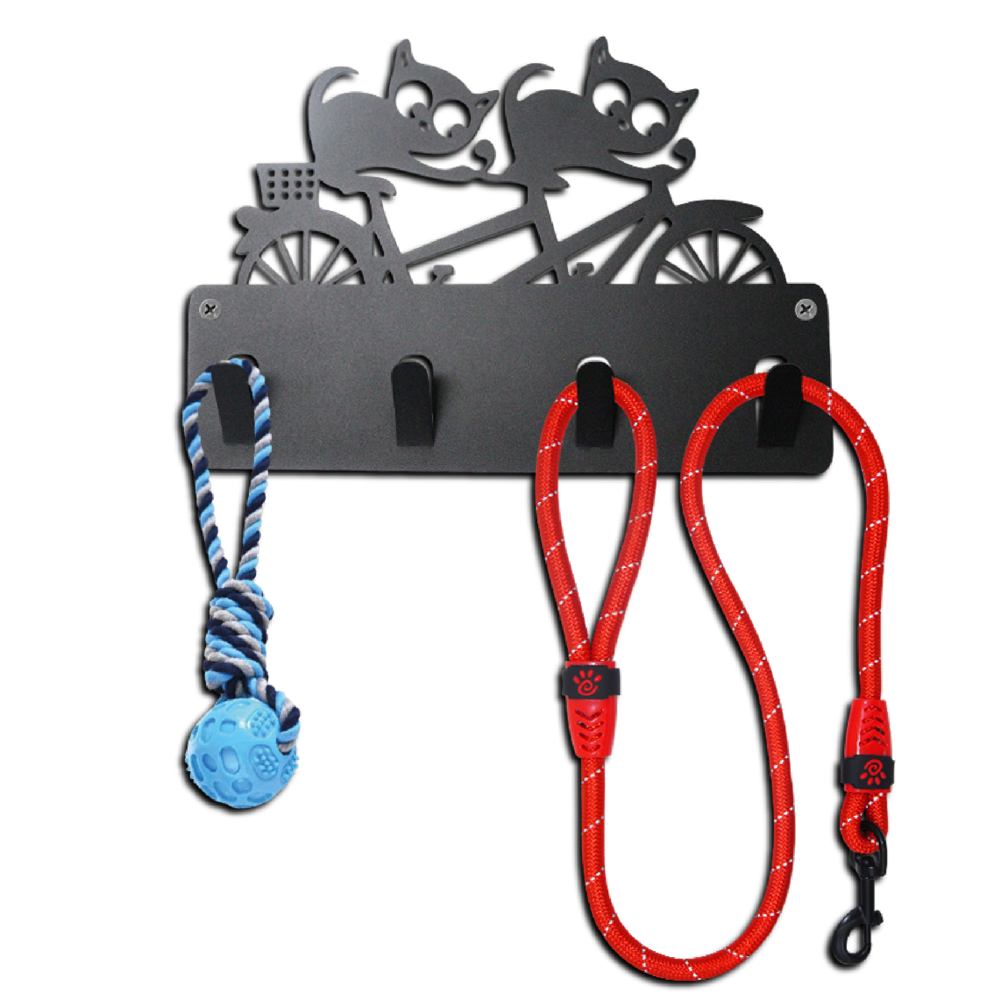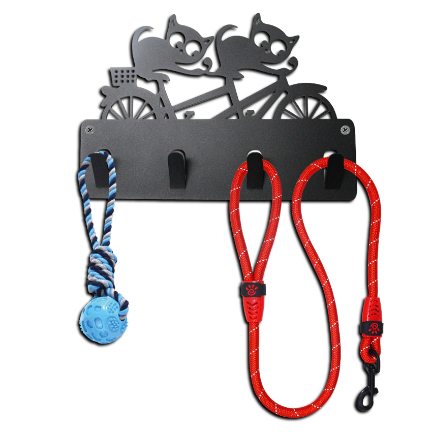 Perchero para mascotas en acero con diseño único de gatos y bicicletas. Ideal para organizar accesorios de tu mascota con estilo, fácil de instalar y personalizable.