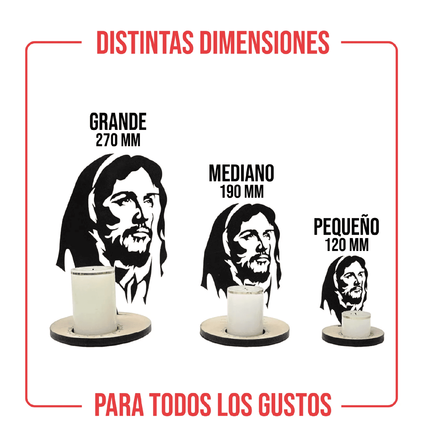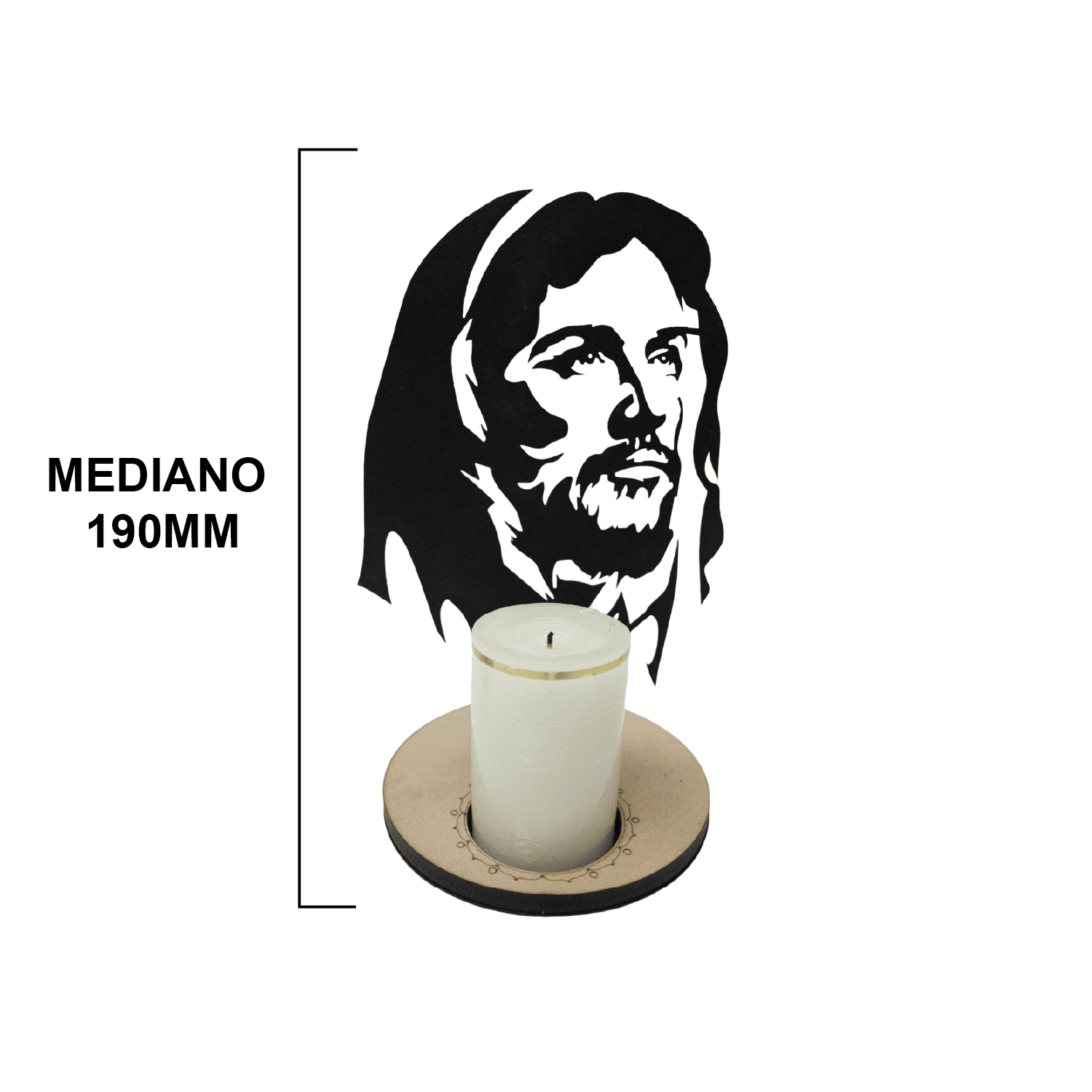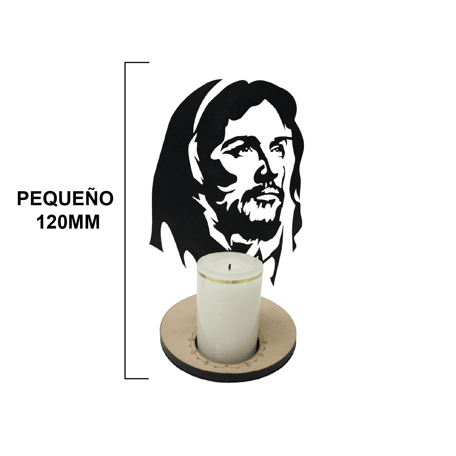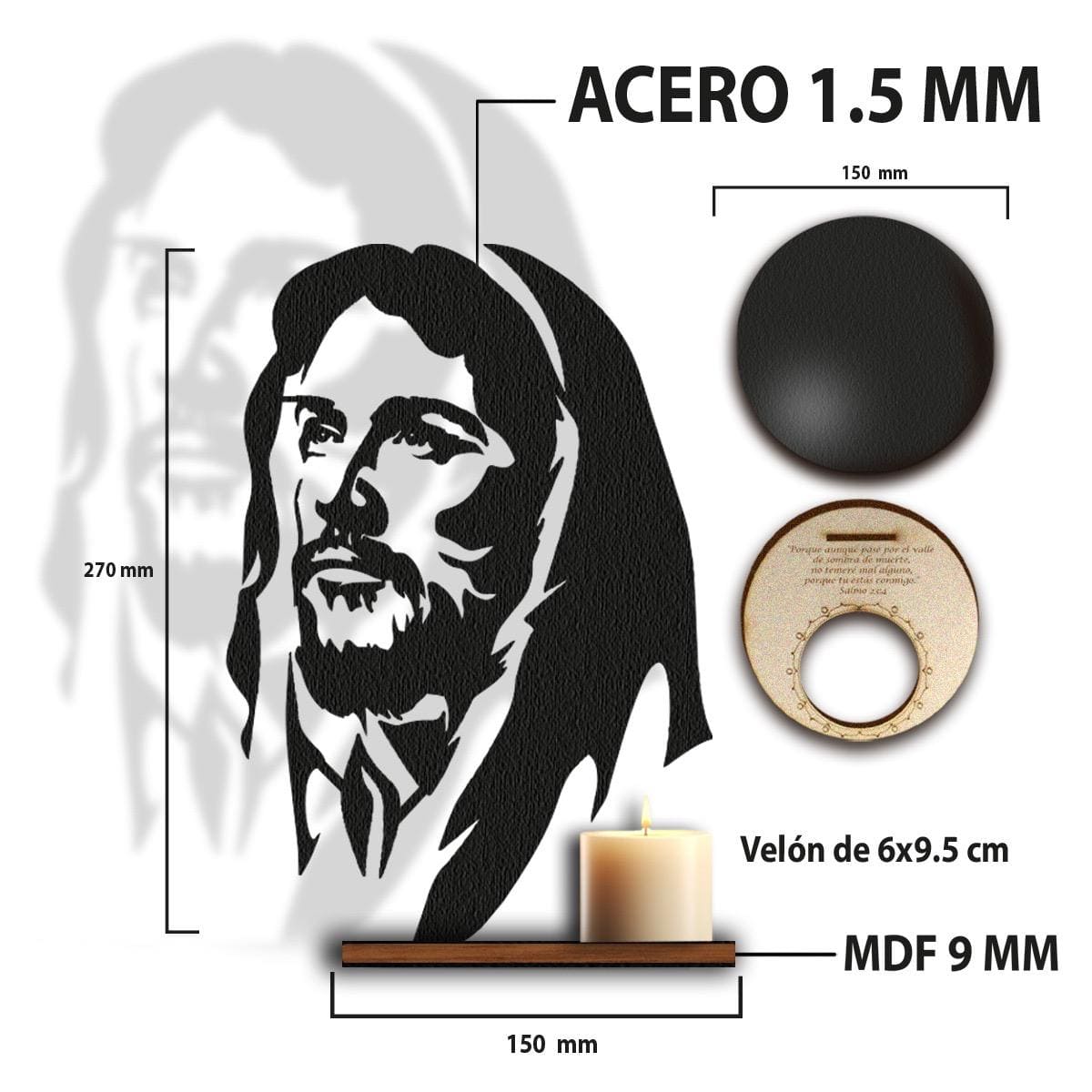 Este porta velas se destaca por su presencia y calidad artesanal. Incluye un velón con 9 cm de altura y 6 cm de diámetro. La figura del rostro de Jesús, esculpida en acero y con acabados en pintura electroestática, ofrece un excelente terminado en calidad y durabilidad a lo largo del tiempo, capturando la serenidad y compasión que emana de su mirada.